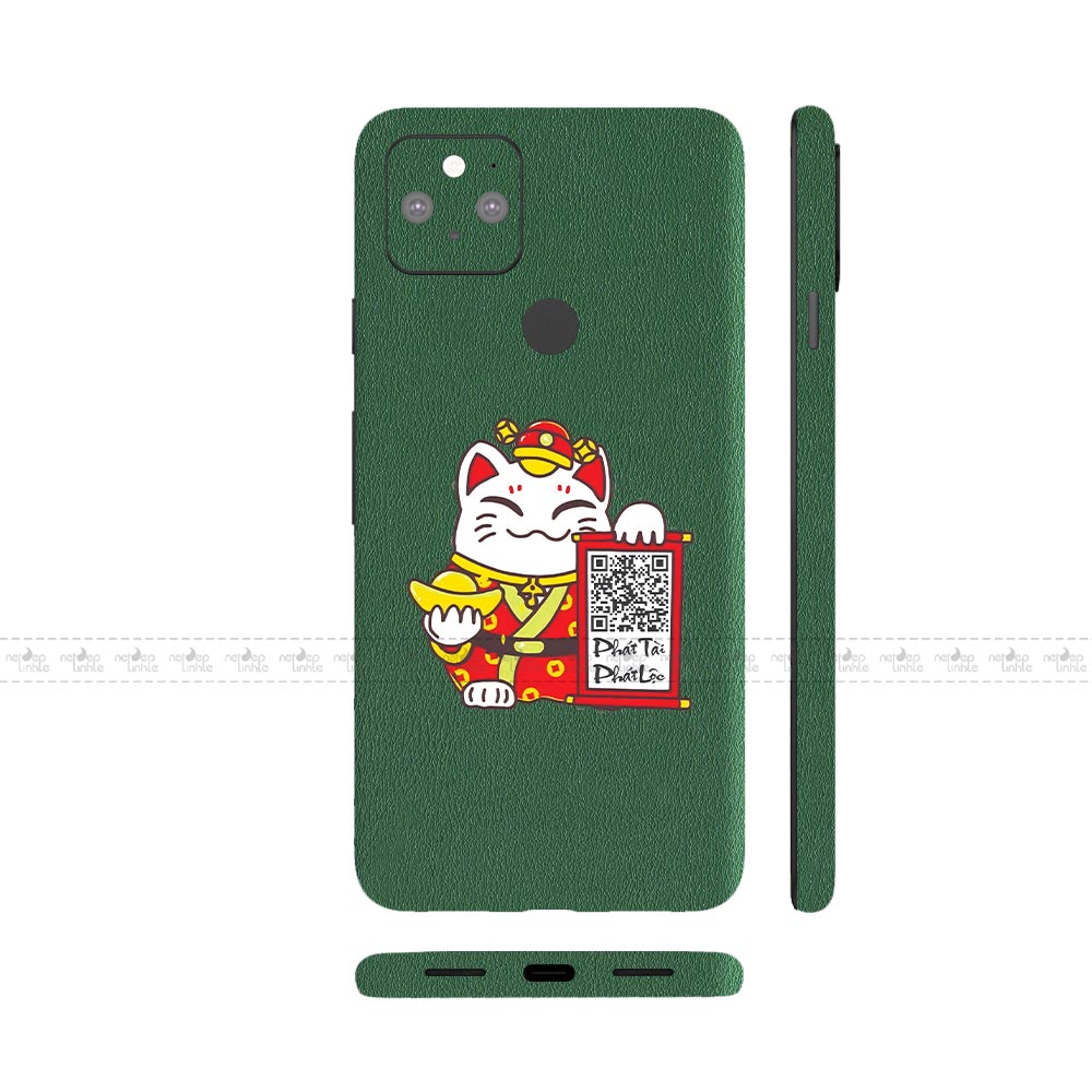 Dán Skin Google Pixel 5 Series Vân Da 3M Màu Xanh Rêu Ghép Mèo Thần Tài