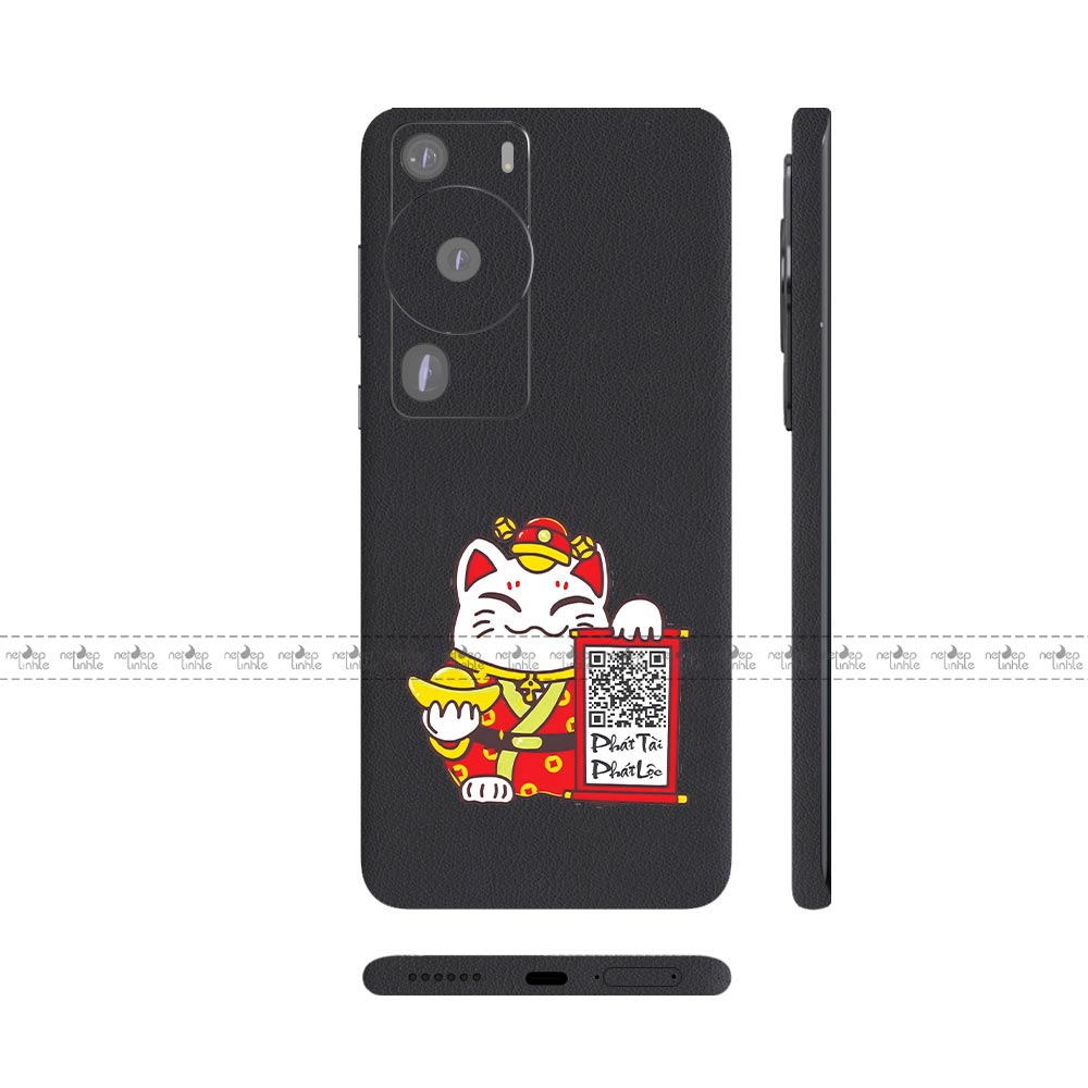 Dán Skin Huawei P60 Series Vân Da 3M Màu Đen Ghép Mèo Thần Tài