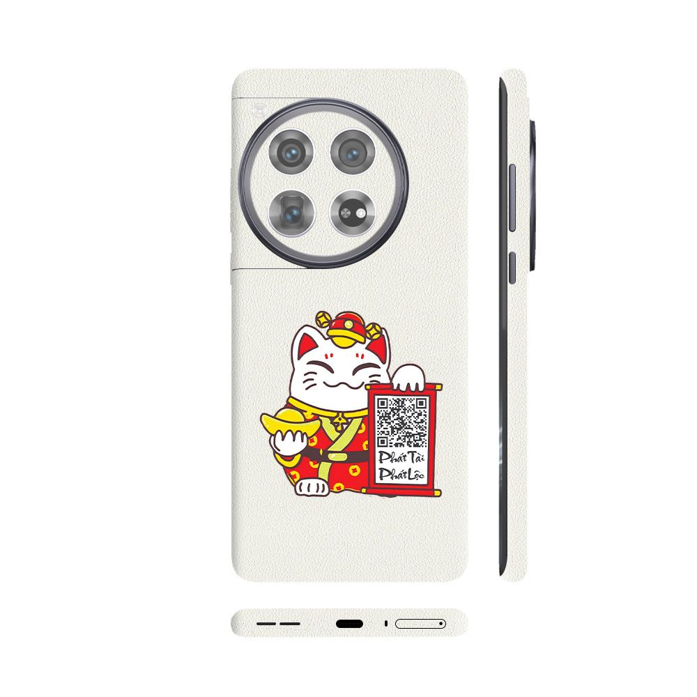 Dán Skin Oneplus 12 Series Vân Da 3M Màu Trắng Ghép Mèo Thần Tài